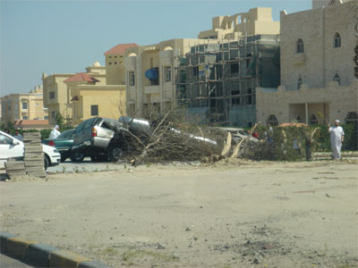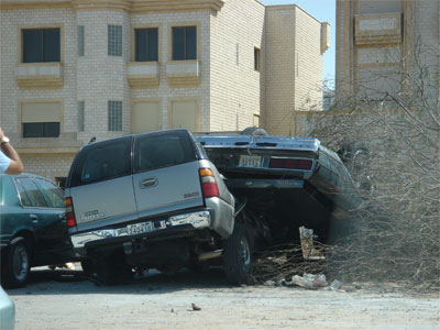 I was on Khalid Bin Abdulazziz where Mishref is on my right and Bayan is on my left. Just after getting off Malik Fahad I saw the traffic coming to a complete stop. And I took a few pictures of the accident, I dont know how it could have happened exactly, but it looks like the chevrolet caprice hit a tree and flipped over and hit the parked Suburban. There also two other cars which are damaged but I dont eve know how they got damaged. There were no police on the seen yet, but I took a couple of pics and left. I can only imagine what the hell happened.