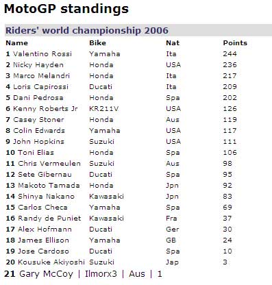 This is one the greatest MotoGP seasons I have seen! It has been amazing seeing different riders take the podium, and Rossi has came up from the rear and taken the front seat. Only one race left today for it to make or break the season for both Nicky Hayden and Valentino Rossi. I really dont have a preference for either of the riders to win, I just want to see a good race because they have both been great this season. Now its really the battle of the titans! Milandri is close behind them, but the real battle is between these two! Im hoping for a good race and cant wait to see the results!