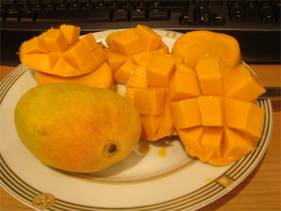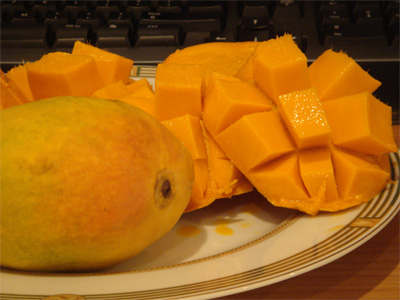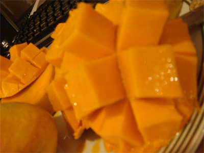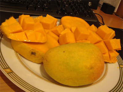 I was tired last night and I didn’t feel like eating too much but I was hungry at the same time. I was in a delimma, but then I passed by the table with fruits and I eyed the mango. I snuck to the table, grabbed a few mangos and scurried back to my room. Then the messiest feast in the world began, it started very organized and well done but as things begun all hell broke lose. Stains everywhere and I felt so damn good, I smiling the whole time I was eating the mangos and I could feel my face was smeared with mango, but I was a happy. I love it when mangos taste this damn good!