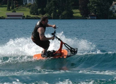 I have probably flipped and hurt myself a million times trying to ski for years. The only thing I was decent in and I really enjoyed was wake boarding. Now this is an interesting product for Kuwait since we are very much into watersports, the Bikeboard Water from Swissboard is a new product for those who like water sports. This is a cross between water skiing and stand-up type jet ski. For $958 this is one hell of product to use in the water, it gets towed by a boat and steering is as you see from the picture, probably really enjoyable as well.
