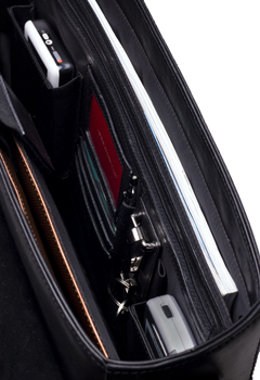 It is made functional for the gadget loving businessman on the go with a protected laptop compartment, pockets for mobile phone, PDA, iPod, pockets for documents on the outside and a way to attach it to a rolling document luggage. It fits laptops with screens up to 15″.