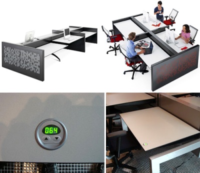 Now this is one funky piece of furniture with integrated technology. I wonder how long it would take to brake it because a lot of people are going to play around with the controls of the table. The main feature of this office furniture is that the tables are all high adjustable, and they can be adjust to different hieghts for each section. In a modern office this can workout very nicely or in a high end library of some sorts. There isn’t a price mentioned since they custom make them to your specifications, but I’m also assuming it isn’t going to be cheap at all.