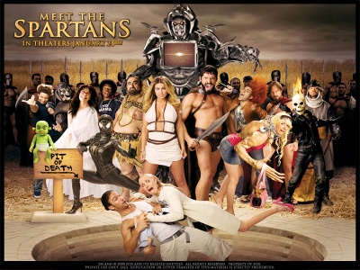 The heroic Leonidas, armed with nothing but leather underwear and a cape, leads a ragtag group of 13 – count ’em, 13! – Spartans to defend their homeland against the Persians (whose ranks include Ghost Rider, Rocky Balboa, The Transformers, and a hunchbacked Paris Hilton)