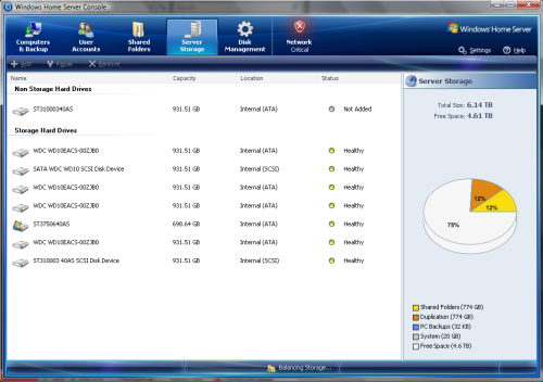 I have the server up and running, dumping files from three machines and the Infrant NAS. I have the Videos in duplication mode, so all my videos are duplicated on the server. Most of drives are in the Athena Backplane, most of it is in the storage pool except for one drive which is what I am going to be using to switch data between drives. Its faster to connect that one drive to the SATA drive of each computer and copy the data, then copy it over at one go by connecting it to the Backplane inside the server. Now to transfer the data from the different networks over to the one location, more drives to be added, and then there is the idea of combining the network.