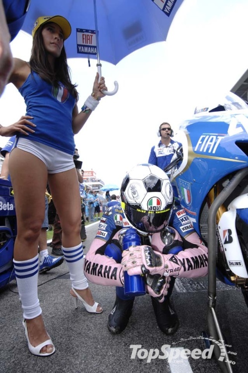 I’m keeping tabs on the Moto GP these days, but it seems that the Euro Cup 2008 is the main event around the globe. The one thing that I can appreciate for the Italians is their spirit and intentsity for the game. And for this event Valentino Rossi painted his motorcycle, helmet, and suit to match the Italian Football Team, and who can forget his supportive female members of the Yamaha Moto GP Team. I want that helmet!