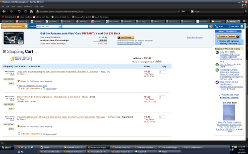 I always tend to postpone purchasing anything from Amazon for a little while until I have a few items. I was looking for a small tripod for use when I’m taking pictures and from a lot of recommendations I’m going with the Gorilla Pod, and this one is meant for DSLR Cameras. Then there are the head phones and after looking around a bit I decided to with the newly updated Bose In-Ear Headphones are my new riding headphones. Fat is a really funny sarcastic book about 3 people trying to drop their weight, and Managing Humans is about how a good engineer doesn’t make a for a good manager, just people skills.