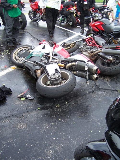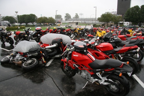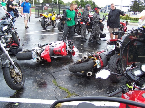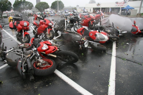 Now this is a painful scene for any Ducatista, a very large meet at the Indy GP the weather was raining and windy. Turns out that had a disastorous effect and knocked a lot of bikes over, it looks like a horrible scene from a movie, some of these bikes were very damaged. I feel sorry for the owner of 1098s Tricolore, that bike took a hell of a lot of damage. What a site to return to for people who had to ride back home. I know its mostly body damage and can be fixed, but still a painful site.