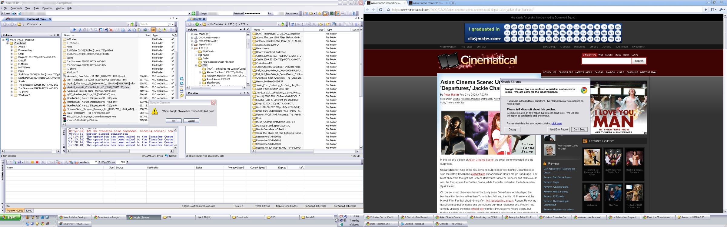 Between all these windows and tabs, Chrome was eating away at the power house of machine. I only built this machine a little over a year and a half ago with the best specifications, and with everything that is running, including an FTP program and a few other programs the machine is running on its last breath every time. I honestly like seeing when its about to crash, its interesting how they built the program to be independent of the other, and every once in a while the Shockwave plug-in crashes, but that doesn’t crash the other tabs. What I find surprising is that Google Chrome uses more Ram then any other browser, it separates the processes so you have many processes taking chunks of ram which add up to a lot, but Firefox takes one huge chunk. Overall I still think that both Chrome and Firefox are excellent browsers, with Chrome being the lighter and faster one.