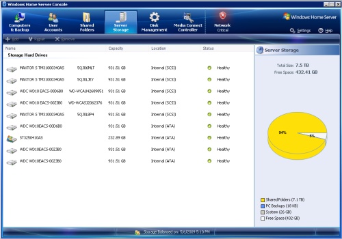 I have been dumping more and more data into my second WHS Server, Hazmat, for a while now. I had about 7.5 TB of space available without duplication, and after a couple of months I have reach 94% of the capacity and I didn’t want any of the files being stored on the OS drive, and I haven’t even switched on duplication for the files which makes the total space needed about 15 TB. I took snap shots of the WHS Console, and by clicking on the smaller images you get the larger images to see all the details.