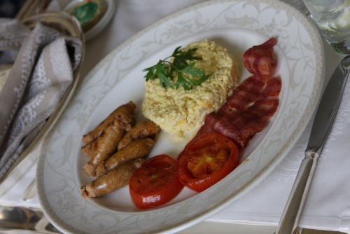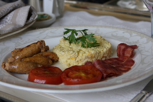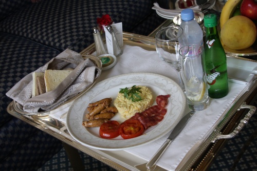 Woke up early in the morning, and my meeting was three hours later. I went over some of the finer points regarding the agenda, and went through some paperwork. 30 minutes and I was hungry, I ordered some scrambled eggs with cheese and onions, some chicken sausages and beef bacon. 20 minutes I heard a knock on my door, and I could smell the food. As soon as I removed the cover it looked better then I expected and tasted even better. A meal fit for a King.