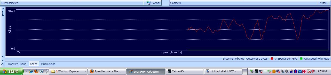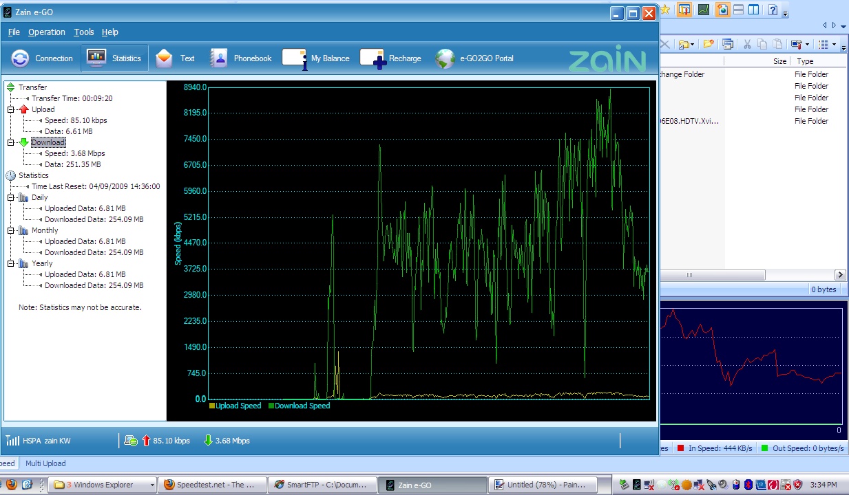 Plug it in, configured the connection for the 3.5 G connection and went to my FTP Server which is co-hosted in Europe(Secret Location) to see what I could download a few large files and see what I would get in relation to numbers. I picked a 2.4 GB file to download and it started off at 450 Kbps which is faster then a 4MB land connection, I was impressed right away, its faster then the old 7.2 MBps E-Go right away. As I gave it time the speed fluctuated between 480 Kbps to 960 Kbps, and then I took it a step further, I got into my car and start stopping in different locations to test it out from the 6th ring road to Bida’a to Salmiya and back. I was impressed, there is a fluctuation in speed but it held solid between a 4MB to 9MB connection at 4:00 pm on Friday which is peak pressure time on the network, and so I’m assuming that late night surfing or downloading is going to be even faster then that.