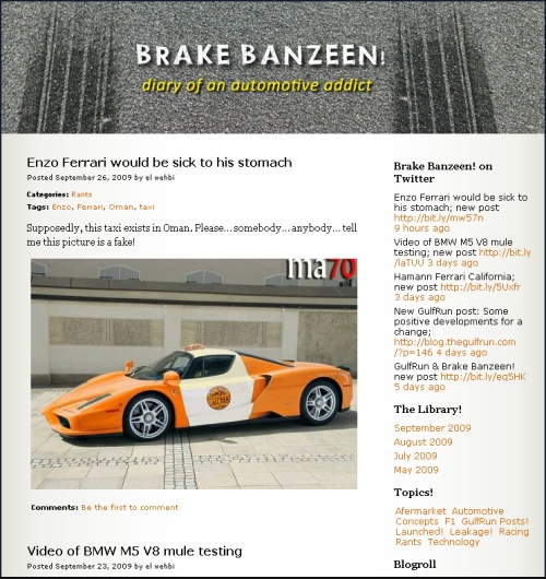 I tend to follow car blogs a lot, to see whats coming next, what are the numbers of the next machines. What else manufacturers have lined up or the troubles some of these companies face. One of these new blogs is Brake Banzeen, I have been following this Kuwaiti blog for some time now and I like it, he tends to have some information before those main car blogs do and sometimes he has some really good juicy videos to watch that make my mouth water seeing some of those machines, like the details on the new M5. If you like cars or anything with four wheels then this blog should be added to your list, I hope he transfers to a main address rather then a wordpress address soon.