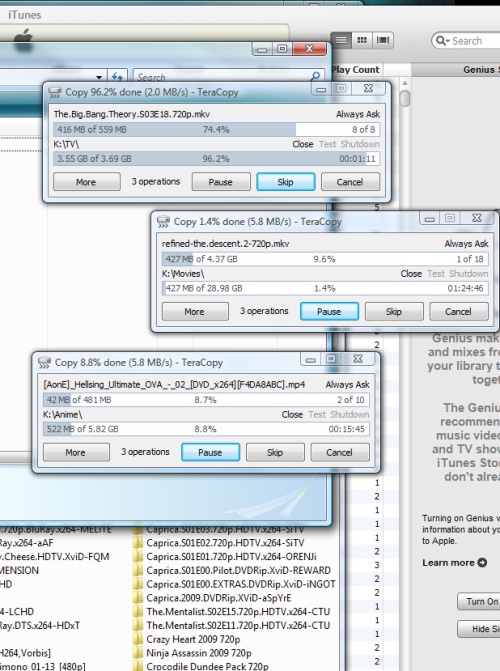 When transfering files from one folder to another you have to wait before starting another or else it will slow down, Windows has matured but they are content with their file moving capabilities of the OS. If your not happy then Teracopy is the best solution period, TeraCopy is a compact program designed to copy and move files at the maximum possible speed. It integrates with XP, Vista and Windows 7 and completely replaces Explorer’s transfer function, so after installing you move files over it automatically comes on and moves files over, and for once you really know how long its going to take. When I do multiple transfers to USB, a storage device on the network and from hard drive to hard drive they are all transferring at maximum possible speed without affecting each other. If I’m doing multiple transfers to one location it divides up the maximum possible bandwidth and sends everything over at the same time if you want to, or else it will organize all the files into one transfer window, and you can see the files are that have been transfered, that are being transfered, and the ones in the queue. The best part is the way it handles the problems you can skip a problematic file and keep on going with the rest of them. An amazing program, very light on the OS and you can have multiple instances working nonstop.