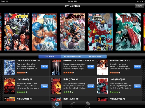 Marvel has turned out to be one of my favorite applications on the iPad, I have always had a love for comics but as I grew up I lost track of all the different Universes, plots and lists of new comics that kept coming up. With the emergence of the iPad they have provided the perfect platform for Comics, I find myself reading for hours and hours these days and I’m enjoying every moment of it, I feel like the Geek in me couldn’t be happier. I read the comics and keep going to the next issue of the series, everything is very organized and you can keep buying the next one. I passed by the Kinokonaya Book Store in Dubai and saw a few Marvel Comics and I really wish they would be released soon on the iPad, and I kept flipping through a few of the comics that were on the table. The best part is that you can go through the categories and view each series on its own making it easier to select the comics you want, and of course the sample is perfect so you get a slight feel of the comic before purchasing.