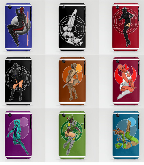 A hilarious set with almost all male Star Wars characters, some of them are funny and some of them are out right disturbing. Dart Vader and Bobba Fett look like the 50s pin up posters, but some of the other guys are not meant to be females. You can get these as covers for your iPhones/iPod and even pin up sketches.