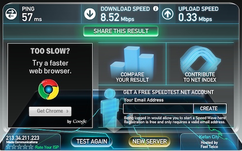 I got speeds varying from 5 to 8 MB Downloads, and 0.2 to 2.8 MB Uploads which is pretty decent. Overall WiMax technology has been around for a little while now but its still a bit unstable. Overall its an excellent service from Mada Communications and I hope they rethink their Data Cap strategy. I was testing using a direct ftp download to check on the speed fluctuations and it ranged from 500 Kbps to 1100 Kbps which is pretty impressive overall, the pings are bit high though so anyone using it for gaming would be annoyed. I like the service I just hope it doesn’t get too saturated and can support a larger number of customers. Also one note they are still not available by the shalaihaat so its still just within the initial areas within the main residential areas around each ring road start from the 6th ring road and heading towards the city. I’m still going to tweak it and mess around with it but overall its pretty good.