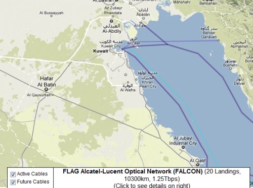 I have always wondered what are the speeds of the fiber optic cables reaching Kuwait and the land based cables reaching Kuwait. Whenever we face an issue with slow internet they blame cut cables, even when it isn’t the case, they just find it convenient to say that. I just came across this website which documents a very large majority of all the fiber optic sea cables in the world, their speeds, when they were connected, and a lot of other information. You can tell what is landing in Kuwait and the speeds. This is supposed to be the sea based map, I hope that it incorporates the land based fiber information at a later point, at this point in time we have a higher dependability on land based fibers coming from Saudi Arabia then we do sea based fibers, and Kuwait is in need of a lot of bandwidth.
