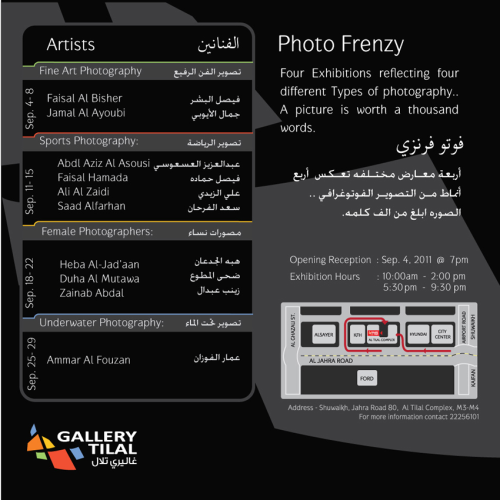At last one of the gallery’s is holding a photo exhibition, there is a lot of talent in Kuwait and Gallery Tilal is having a Photo Exhibition or Photo Frenzy for the whole month of September which I think is fantastic. Four Exhibitions reflecting four different types of photography, I am excited to see what they have lined up and I’m sure its going to be fantastic, there will be a type of exhibition each week so I’m hoping that I will be able to make it, I do love the categories they have chosen.