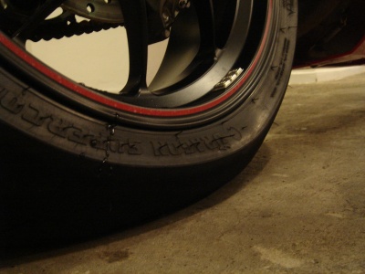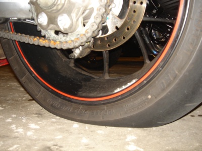 Friday I went for a quick ride to satisfy my urge to ride when I was going around the corner and I felt the bike dip quicker then usual which I thought was odd and continued. Then as I was turning in for the next corner I felt the bike dip in quicker again, so then I pulled over and looked at the rear tire and I saw that it was a little low on air and decided to head home.